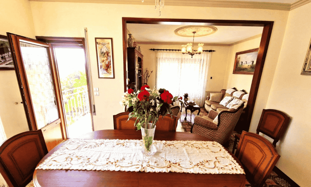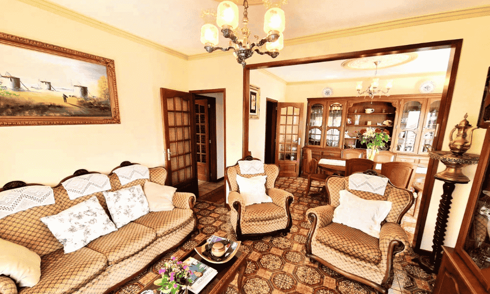 No rés-do-chão, um hall de entrada recebe com elegância e um WC de serviço acrescenta funcionalidade ao quotidiano. No primeiro piso, a cozinha principal, mobilada e equipada, comunica com uma sala de estar e jantar com varanda e vista desafogada. O piso completa-se com três quartos (dois com roupeiros embutidos) e uma casa de banho completa com banheira.